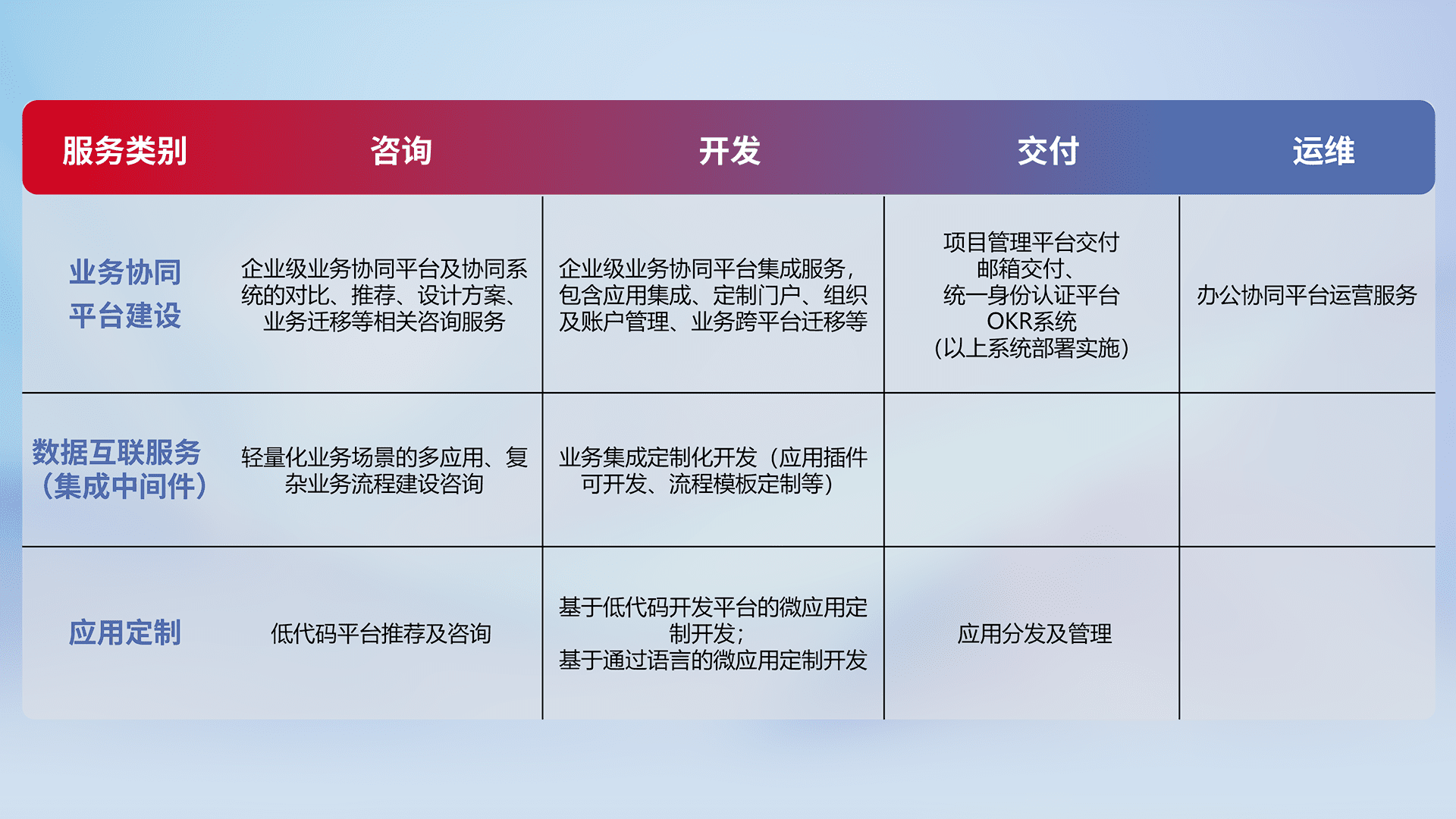 针对钉钉、、、、企微、、、IDaas等平台级产品提供产品的规划、、方案、、、、交付、、、定制化开发等服务,,实现如统一协同办公、、智能客户服务、、、混合会议管理、、、、智能数据查询、、、、等业务场景,,,实现数字化转型。。
